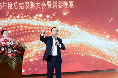 总经理朱小军致祝酒辞,向董事长、全体员工及供应商伙伴致以新春问候与感谢,肯定大家过去一年的辛勤付出与同心协作,并送上马年吉祥安康、万事顺遂的美好祝福。